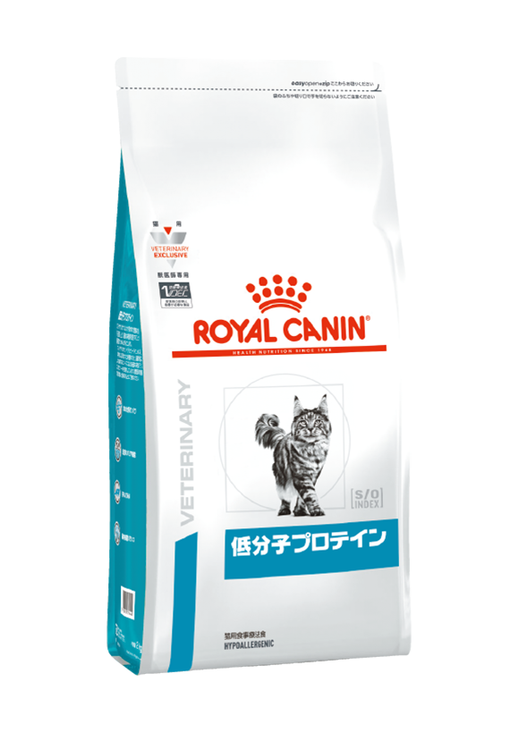 猫用 低分子プロテインは、食物アレルギーによる皮膚症状および消化器症状を呈する猫に給与することを目的として、特別に調製された食事療法食です。この食事は、食物アレルギーの原因となりにくい加水分解したタンパク源を使用しています。