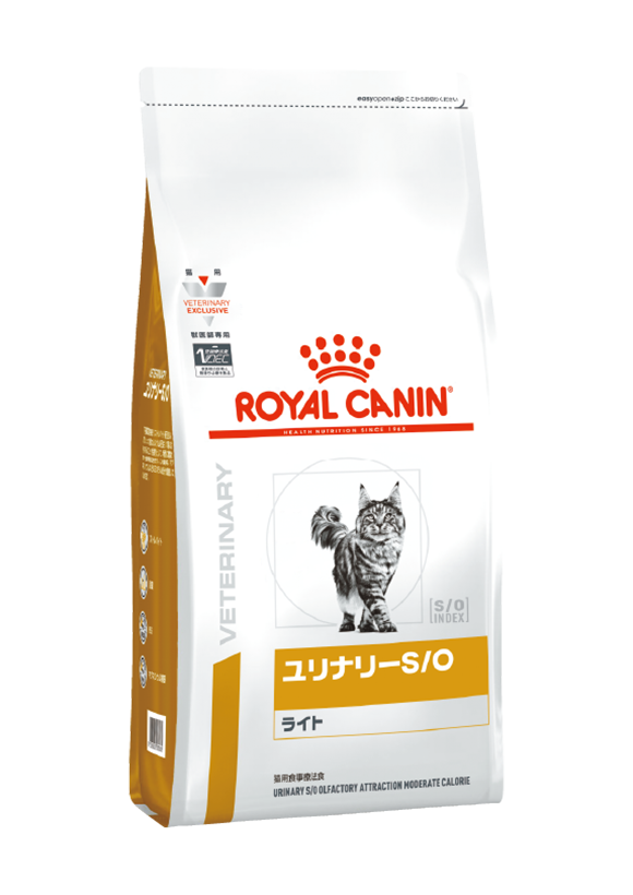 猫用 ユリナリーS/O ライト は、下部尿路疾患(ストルバイト結石症およびシュウ酸カルシウム結石症)の猫に給与することを目的として、特別に調製された食事療法食です。この食事は、マグネシウムなどのミネラル成分を調整しています。さらに、体重過多に配慮してカロリー密度を低く調整しています。