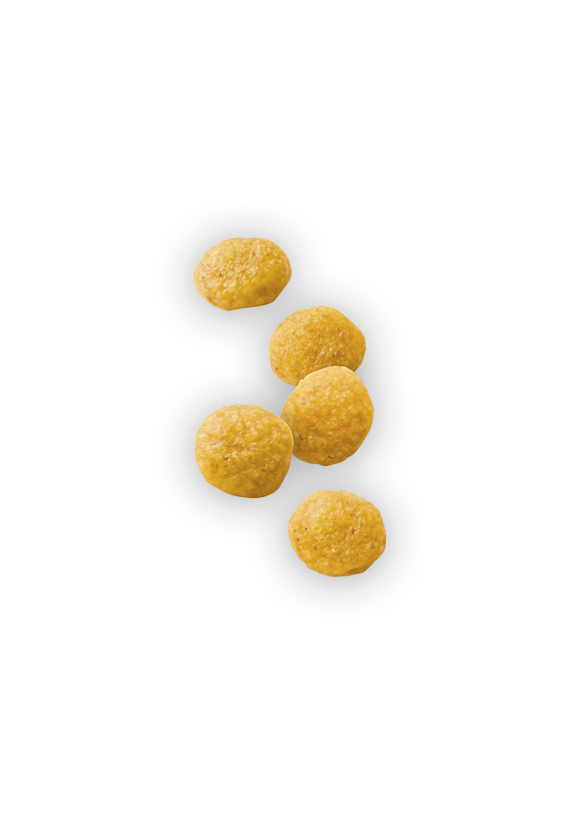 コーン、超高消化性小麦タンパク(消化率90%以上)、米、タピオカ、動物性油脂、コーングルテン、加水分解タンパク(鶏、七面鳥)、チコリー、大豆油、魚油(オメガ3系不飽和脂肪酸〔EPA+DHA〕源)、亜麻の種子、フラクトオリゴ糖、ルリチシャ油、マリーゴールド(ルテイン源)、アミノ酸類(L-リジン、タウリン、DL-メチオニン)、乳化剤(グリセリン脂肪酸エステル)、ゼオライト、ポリリン酸ナトリウム、ミネラル類(Cl、Ca、K、P、Na、Zn、Mg、Mn、Fe、Cu、I、Se)、ビタミン類(コリン、E、ナイアシン、C、パントテン酸カルシウム、B6、B2、B1、葉酸、A、ビオチン、B12、D3)、保存料(ソルビン酸カリウム)、酸化防止剤(ミックストコフェロール、ローズマリーエキス)