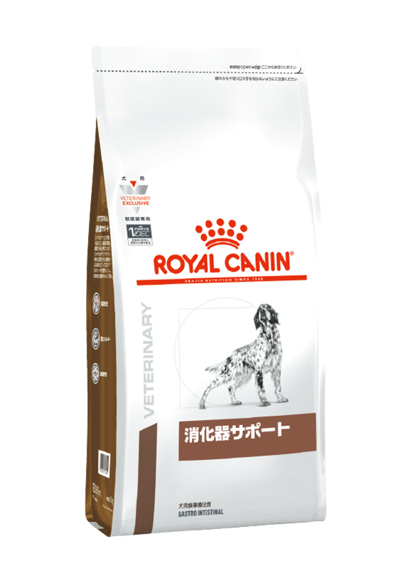 犬用 消化器サポートは、消化器疾患(代表的な症状は嘔吐、下痢、軟便など)の犬や栄養要求が高まっている犬に給与することを目的として、特別に調製された食事療法食です。この食事は、消化性が高い原材料を使用し、少ない食事量でも必要なカロリーや栄養素が充分に摂取できるように調整されています。また、健康的な腸内細菌バランスに配慮して可溶性食物繊維(サイリウム、フラクトオリゴ糖、マンナンオリゴ糖)を配合しています。