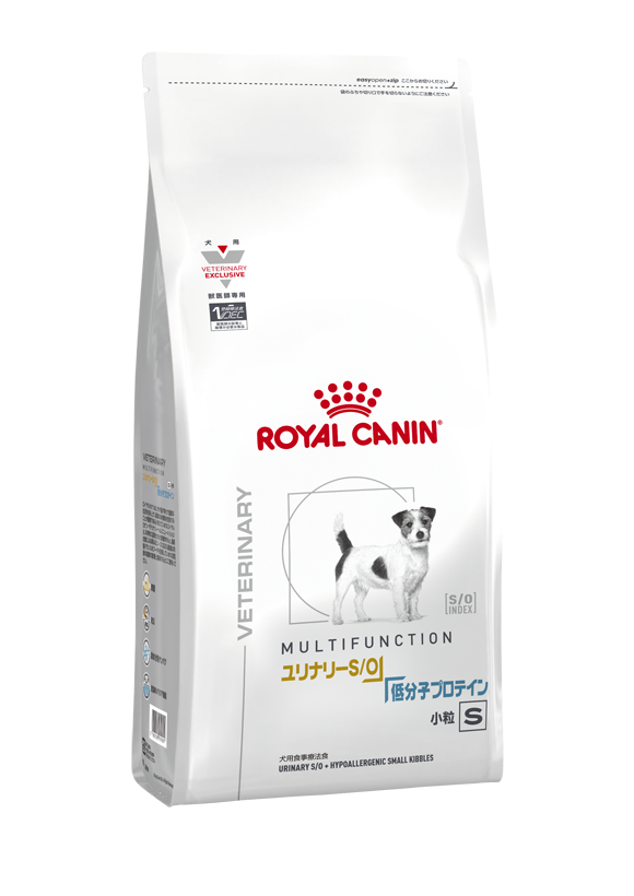 犬用 ユリナリーS/O+低分子プロテイン 小粒は、下部尿路疾患(ストルバイト結石症およびシュウ酸カルシウム結石症)で食物アレルギーによる皮膚症状および消化器症状を呈する犬に給与する目的で特別に調製された食事療法食です。この食事は、下部尿路疾患に配慮してミネラルなどの栄養バランスを調整し、マグネシウム含有量を制限しかつ食物アレルギーの原因となりにくい高消化性の加水分解大豆タンパクを使用しています。