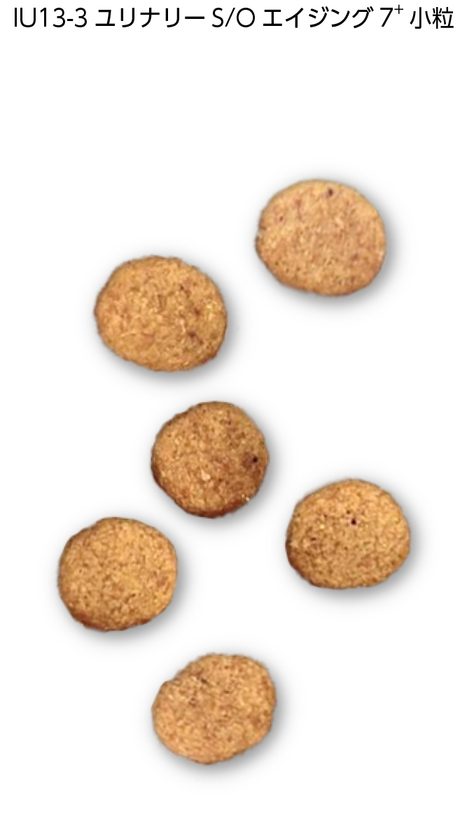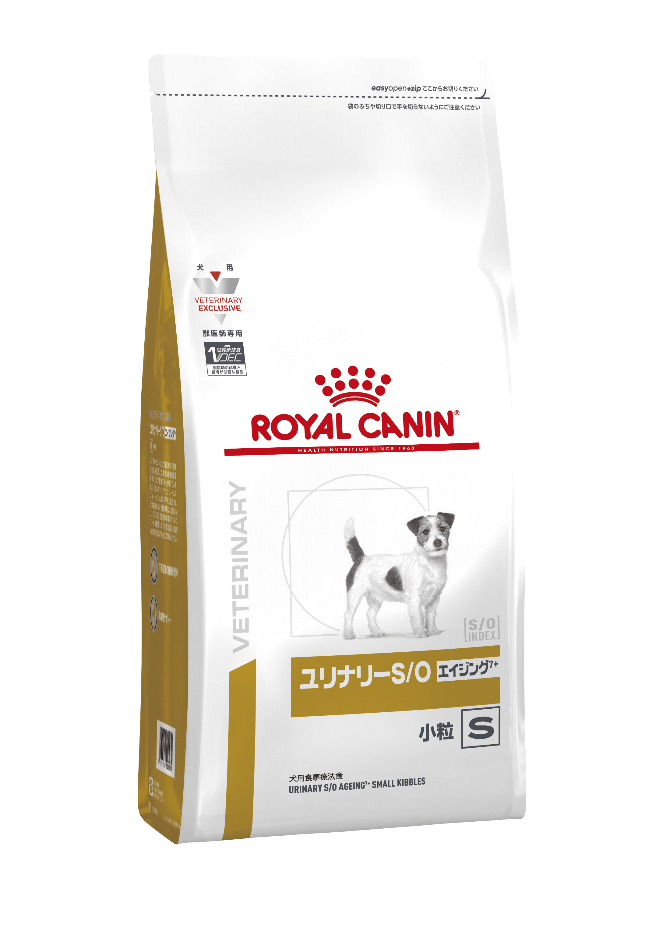 犬用 ユリナリーS/O エイジング7+ 小粒は、下部尿路疾患(ストルバイト結石症およびシュウ酸カルシウム結石症)の犬に給与することを目的として、特別に調製された食事療法食です。この食事は、マグネシウムなどのミネラル成分を調整しています。