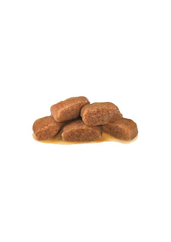 鶏肉、豚肉、小麦粉、セルロース、コーンスターチ、小麦タンパク、魚油(オメガ3系不飽和脂肪酸〔EPA+DHA〕源)、調味料(アミノ酸類)、加水分解酵母(マンナンオリゴ糖源)、マリーゴールドエキス(ルテイン源)、アミノ酸類(グリシン、タウリン、メチオニン、L-カルニチン)、増粘安定剤(増粘多糖類)、ゼオライト、ミネラル類(Na、P、K、Cl、Ca、Zn、Fe、Cu、Mn、I)、ビタミン類(コリン、D3、E、B1、C、ナイアシン、B2、パントテン酸カルシウム、B6、葉酸、ビオチン、B12)